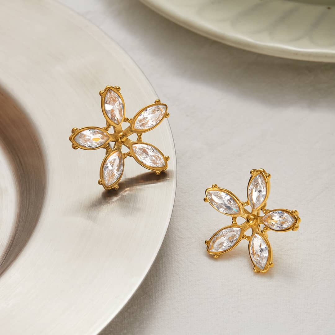 Succombez à l’élégance intemporelle de ces boucles d’oreilles en or en forme de fleur, délicatement ornées de pierres éclatantes pour illuminer votre visage. Leur design raffiné ajoute une touche de glamour à toutes vos tenues, du quotidien aux grandes occasions. Disponibles en finition or jaune, avec des pierres scintillantes aux reflets subtils, elles mesurent environ 1,5 cm de diamètre pour une allure sophistiquée et discrète. Parfaites comme cadeau précieux ou pour compléter votre collection de bijoux, ces boucles d’oreilles transformeront chaque moment en instant spécial.